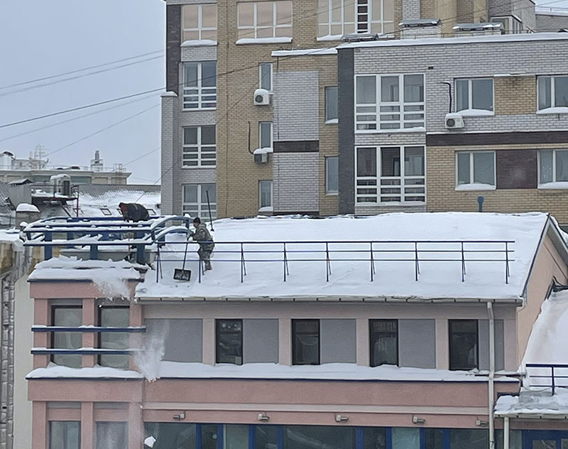 Запрещается очистка кровель от снега и наледи при неблагоприятных погодных условиях (сильном ветре).